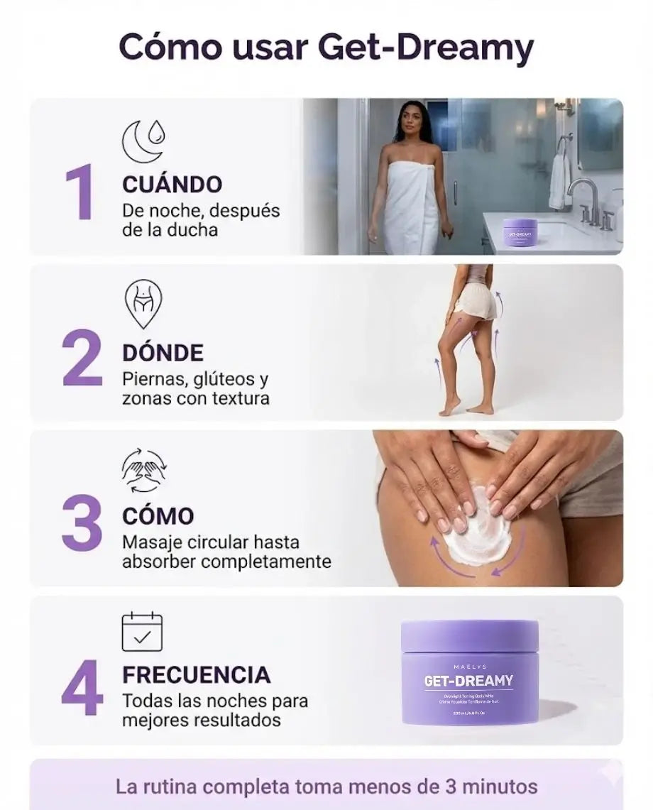 Aplicar por la noche (ideal después de la ducha), en zonas como piernas, glúteos, brazos. Masajear en círculos hasta que se absorba.